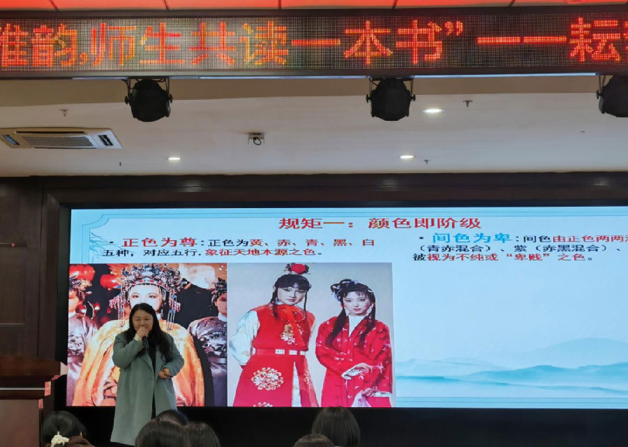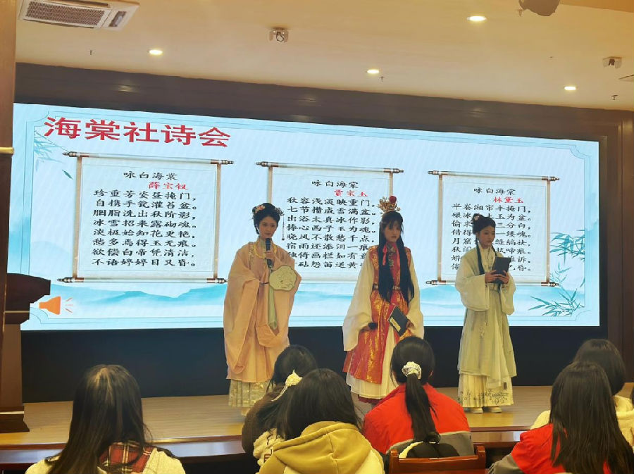 活动伊始,乐安一中的王芳老师登台主讲。她举止优雅、言辞温婉,以《红楼梦》的服饰文化、诗词文化与灯谜艺术为三大脉络,层层递进地展开解读。王老师指出,书中服饰既是阶级的显性标识,亦是身份的隐性密码,一针一线间皆沉淀着中华传统文化的深厚底蕴。讲解间隙,三位身着林黛玉、贾宝玉、薛宝钗经典服饰的乐安一中优秀阅读少年惊艳登台,在悠扬的背景乐中吟咏贾宝玉,林黛玉和薛宝钗三人的《白海棠诗》。她们声情并茂的演绎,将诗作中的清雅之韵与人物的性情风骨展现得淋漓尽致,引得现场掌声不断,掀起活动首个小高潮。