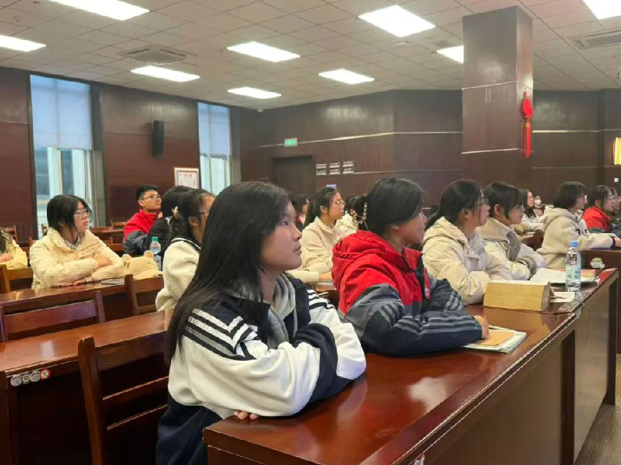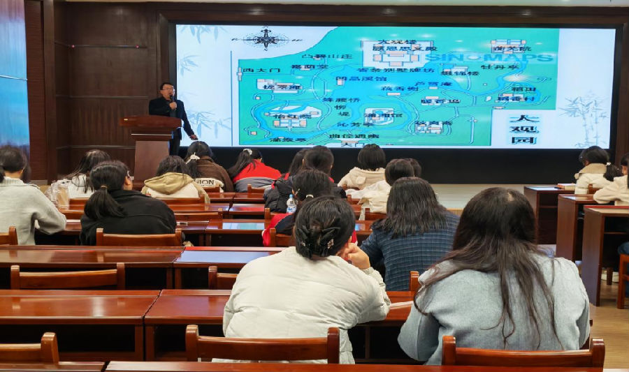 最后,临川二中的杨波老师带来一场内容丰富多元、生动鲜活的讲座。他从饮食文化、建筑文化、人际关系、官场文化四大生活维度切入,再延伸至书中精妙的修辞艺术与暗藏命运伏笔的谶语文化。杨老师旁征博引,辅以大量图片、数据与影音资料,让抽象的文化内涵变得直观可感。尤其在解读“林黛玉进贾府”片段时,他聚焦王熙凤的话术艺术,细致剖析其一句话夸赞八人的沟通智慧,生动展现了书中人际关系的复杂与精妙,让在场学生频频点头、恍然大悟,为大家打开了读懂《红楼梦》的全新视角。