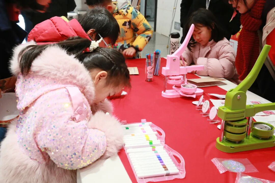 完成闯关的读者朋友们凭借盖满章的“文脉通关文牒”至服务台领取材料包,亲手绘制独属于自己的新年徽章。