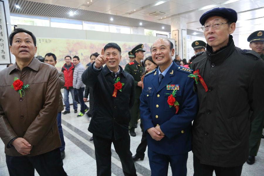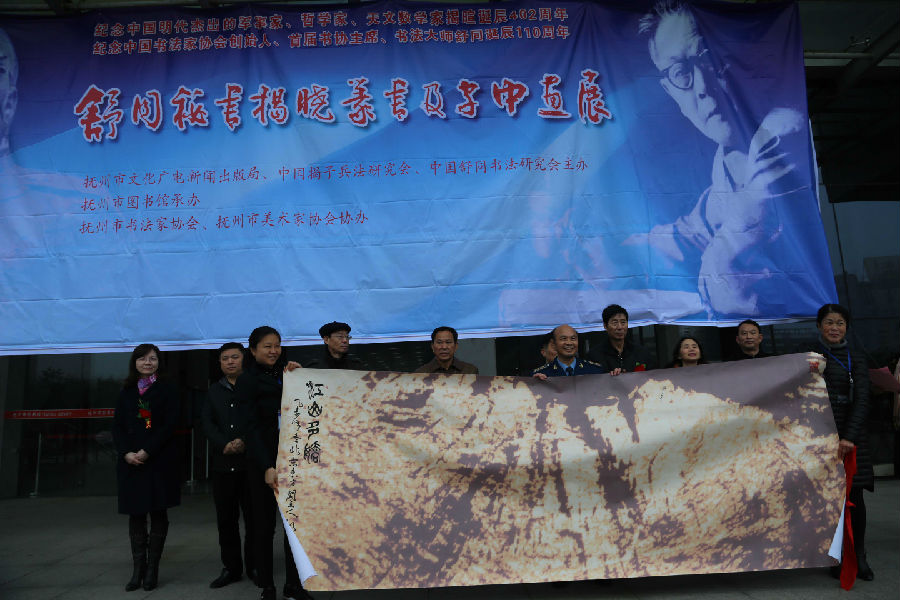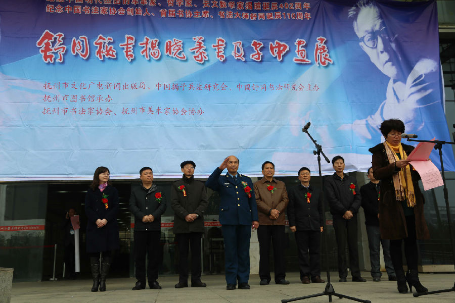12月21日上午,为纪念抚州籍中国明末清初中国杰出的军事家、哲学家、天文数学家揭暄诞辰402周年和中国书法家协会创始人、首届书协主席舒同诞辰110周年,由抚州市文化广电新闻出版局、中国揭子兵法研究会主办,中国书协名誉主席张海题写展名的舒同秘书揭晓篆书及字中画展,今天在抚州市图书馆隆重开幕。抚州市人大常委会主任黄牡香,抚州市政协主席谢发明,中共抚州市委常委、宣传部长黄玉剑,江西省图书馆副馆长黄俊,抚州市人大常委会副主任陈克,作者揭晓大校和夫人江玉兰,舒同故里东乡县政府主席陈勤,揭暄故里广昌县委常委、宣传部长洪斌,抚州市图书馆馆长孔彬,江西省书协副主席、抚州书协主席陈胜华,抚州市美协主席王建平等领导以及来宾共百余人出席开幕式。黄玉剑部长致开幕式词,黄俊、陈勤、洪斌致辞,揭晓致答谢词。开幕式由抚州市文化广电新闻出版局局长谭玉英主持。