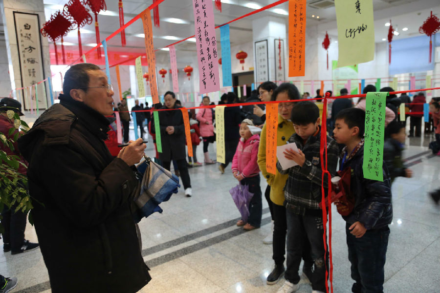正月十五是中国传统的元宵佳节,民间有猜灯谜习俗,2月22日元宵节上午,市图书馆在一楼大厅举办了“闹元宵·猜灯谜”活动,谜语分灯谜及知识问答两部分,灯谜主要有成语、地名、人物、历史名词、动植物等类型,知识问答围绕市图书馆2015年所做工作等出题。