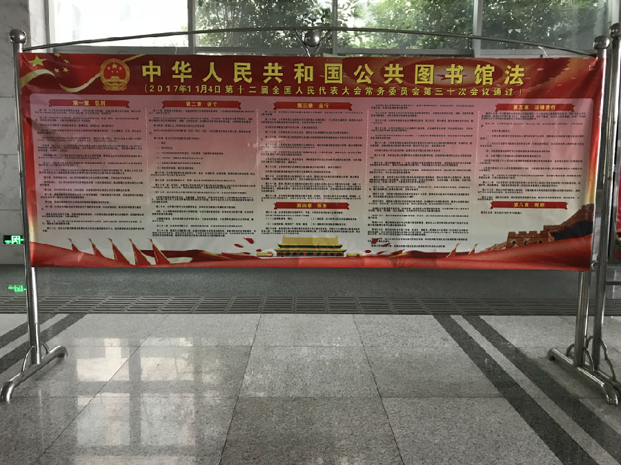 其次是采取多种方式提高《公共图书馆法》宣传效果,主要有:一是制作《公共图书馆法全文》宣传栏,摆放在大门口显眼位置进行宣传,同时在已开放的报刊阅览室、图书展台及办证处等活动窗口摆放《公共图书馆法》宣传册,吸引读者注意,适时向读者讲解。二是利用我馆官网、官微等平台,发布内容通俗易懂、图文并茂的《公共图书馆法》图解专题版面,扩大宣传受众面、提高宣传效果。三是为我市“两会”代表提供解读服务。“两会”代表具有较高的社会影响力,是普法宣传的重要力量,在我市“两会”召开期间,我馆在两会信息服务点向“两会”代表发放了《公共图书馆法》宣传册,并为他们详细解读《公共图书馆法》在办馆条件、政策支持、总分馆制、数字资源建设、服务设施、自助服务等方面的具体规定。