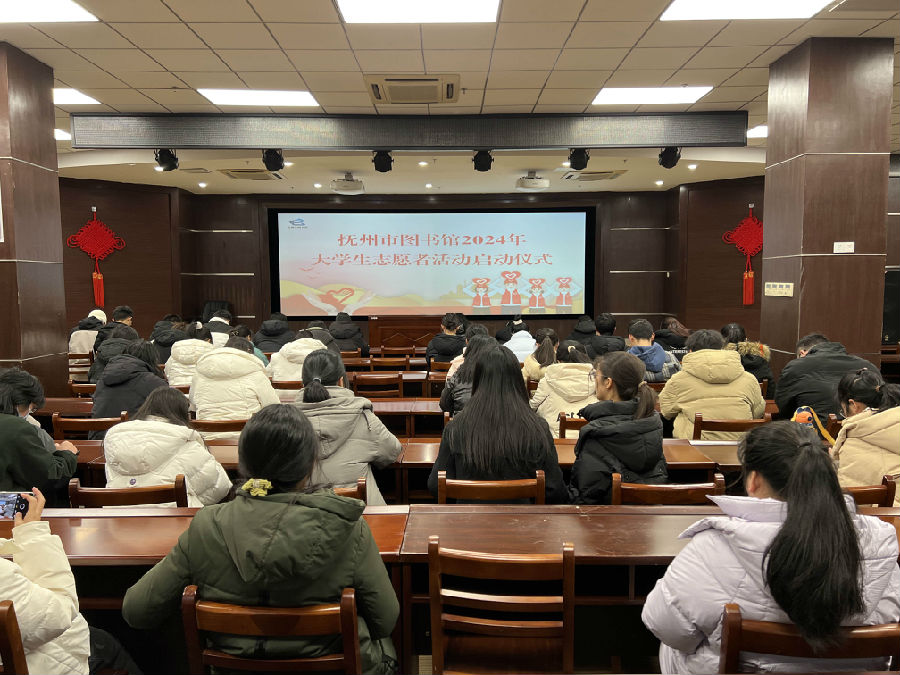 为进一步弘扬“奉献、友爱、互助、进步”的志愿精神,完善图书馆志愿者服务的团队建设,推动图书馆志愿服务工作,1月25日上午,抚州市图书馆2024年大学生志愿者活动启动仪式在三楼报告厅举行。