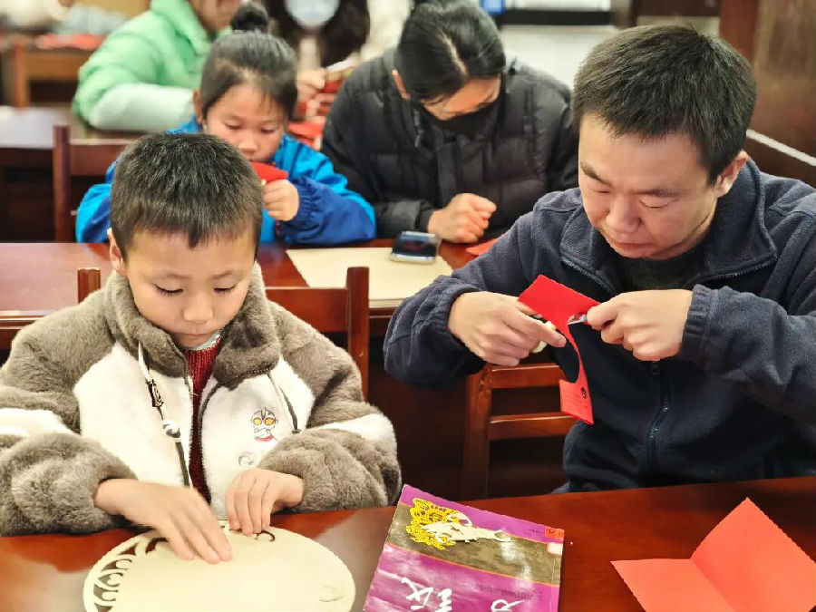 阅读的余韵尚未散去,非遗剪纸环节已悄然接续。家庭们巧手执剪,以彩纸为媒,将书中读到的情节、形象转化为一幅幅生动的剪纸作品。剪刀游走,纸花绽放,三十分钟的创作时光里,孩子们天马行空的想象力与家长细致的辅助相得益彰,传统文化不再停留于书本,而在亲子共创中被触摸、理解和传递。
